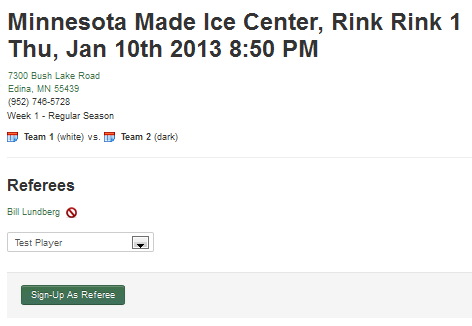 Using the drop-down box, choose the player on your account who will officiate the game and click the 'Sign-up as Referee' button. If at any point before the game you decide to remove yourself as a referee of the game, click the red icon next to your name.